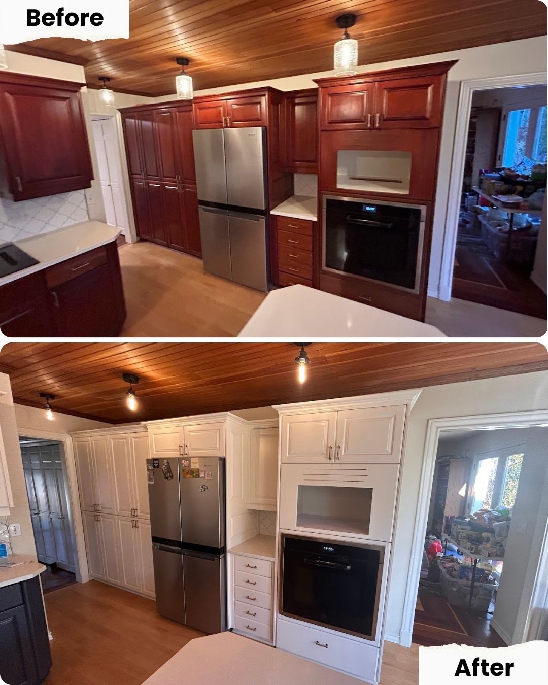 We were introduced through our lovely friend Marilyn over at Precision Countertops. These clients were looking for a refresh on their kitchen cabinet boxes. These can be tricky projects, however all the ingredients were there for us to have a successful project and deliver on what we promised. Natural wood refinishing is absolutely more of an art than a skill, and our team delivered!
