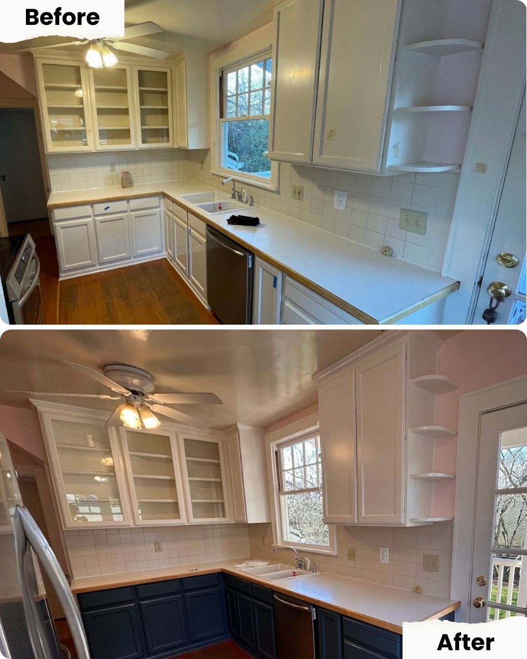 These clients hired painters only a couple years ago for the cabinets, and quickly realized there were issues. Color fade, paint chipping, and even ruined hinges. This is a classic case of poor prep and low quality paint. We started back at step one and brought everything up to a Pearl Painters standard, creating mechanical and chemical bonding onto cabinet surfaces, more sanding than you can imagine, and spraying proper cabinet grade paint in a professional fashion. The result is a beautiful kitchen that will actually LAST! Also as a side note this is the third project we have done for this client. Here’s their Google review too:
