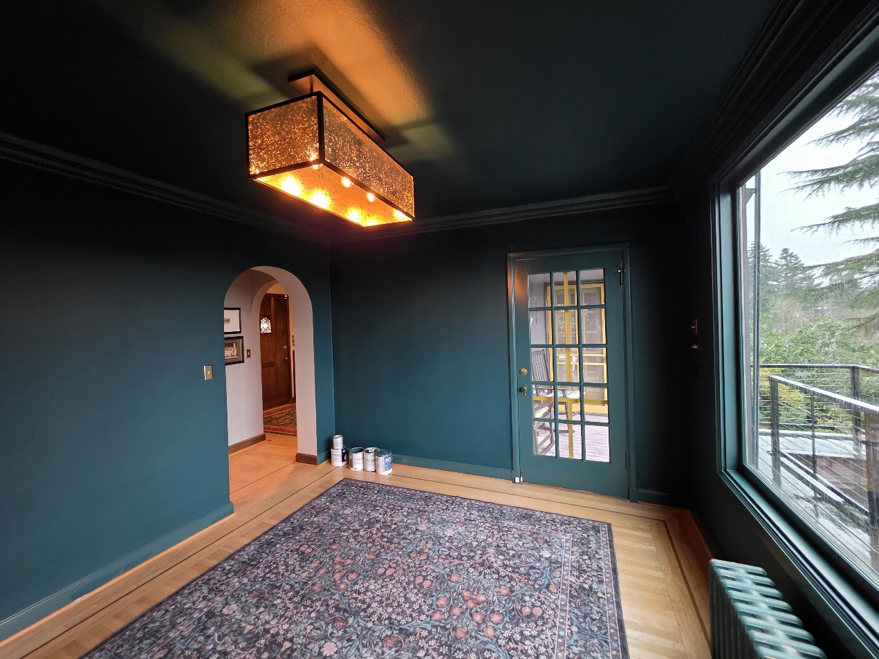 Another long time client had us out for some repair work and one of our new favorite growing trends, color drenching! We took care of the office, handling some wall repair and painting walls, ceilings & trim. This home has a really cool dining room that has been repurposed into a speakeasy of sorts, and this is wear we did the color drench. You can see just how dramatic and bold the color has made the space, and it really lends itself to the vibe they were going for.