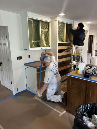 The client hired a contractor through a friend, but they botched the cabinet job so badly she eventually had to fire them. Two other painters failed to fix the damage, leaving her with ruined doors and months of frustration. Eight months later, she called us – we restored her worst cabinet as a test, earned her trust, and then completed the whole kitchen.